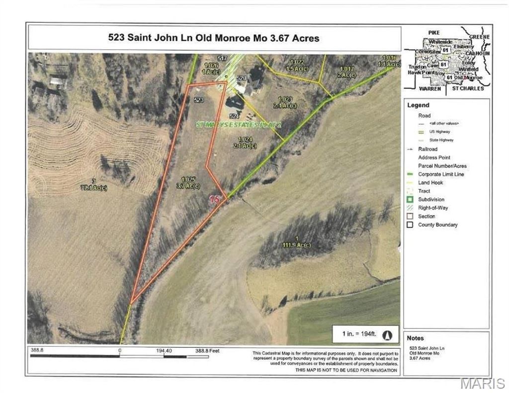 This is your chance to build your dream home and secure your slice of the American dream in a serene, picturesque setting. Discover the perfect 3.67-acre parcel in Old Monroe, nestled in the unincorporated area of Lincoln County. This prime location in a private cul-de-sac offers a homesite with private countryside views, ready for your custom builder and plans. Tree lined. All essential utilities, including gas, electric, water, and sewer, are available, and the property features concrete streets for easy access. Just Minutes from O'Fallon, St. Peters , Hwy 79 and 64 Corridor. House minimums:Ranch 1700, 2 sty: 2000 , Multi Levels:1200 sq ft