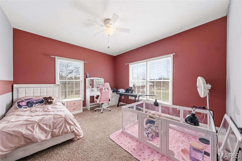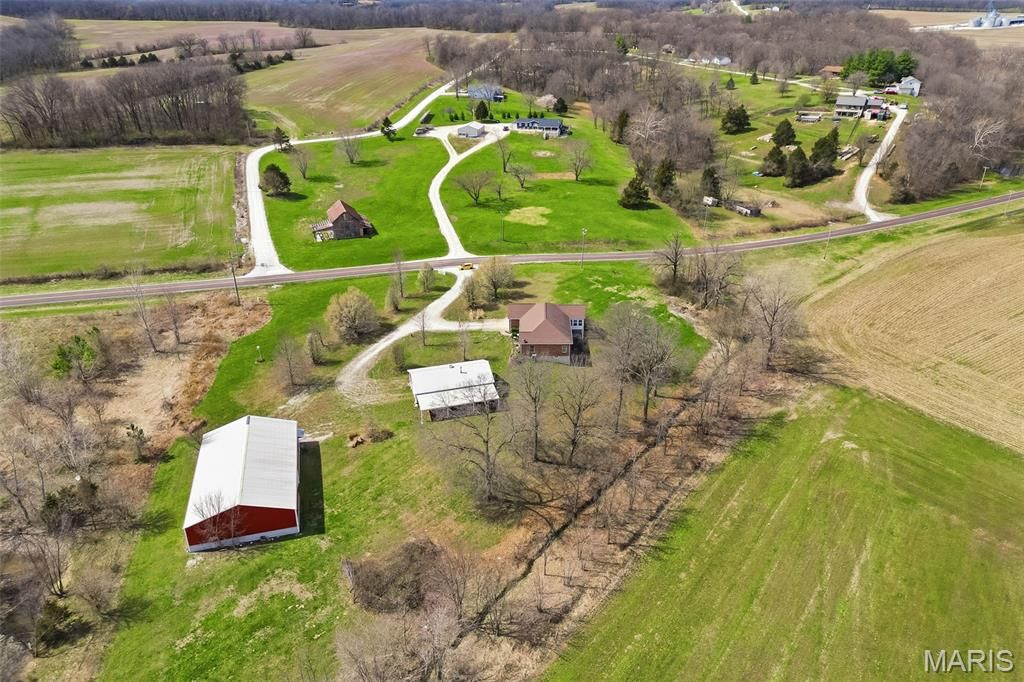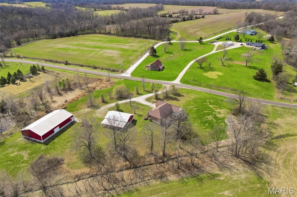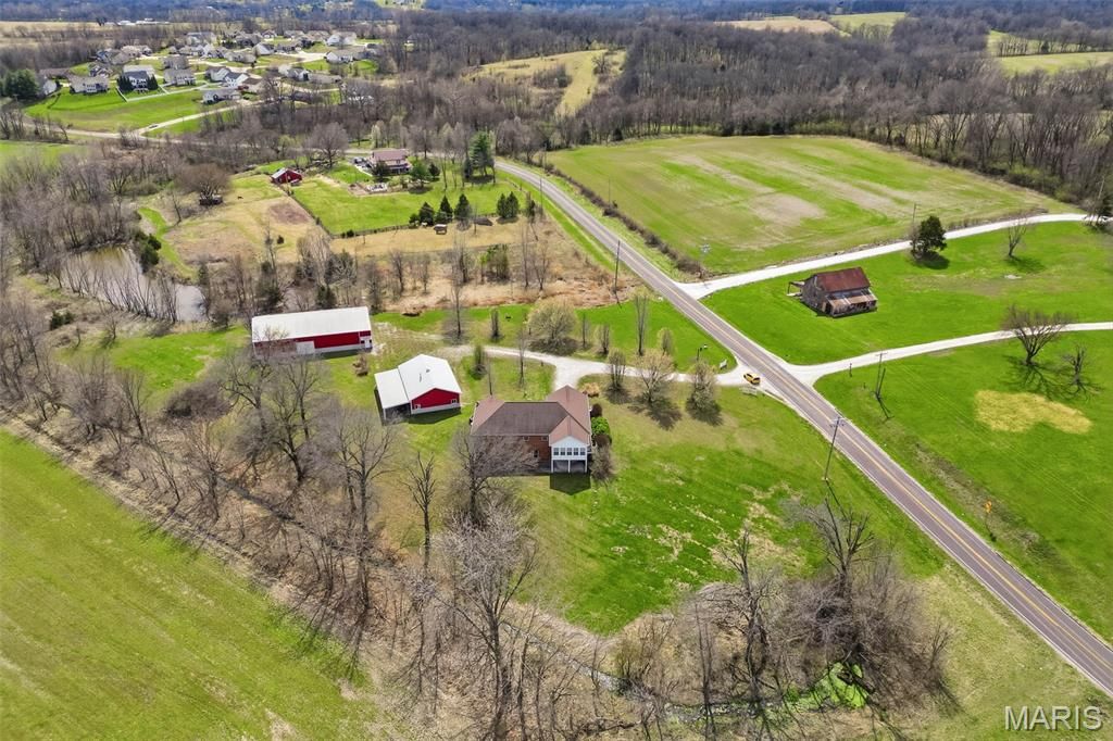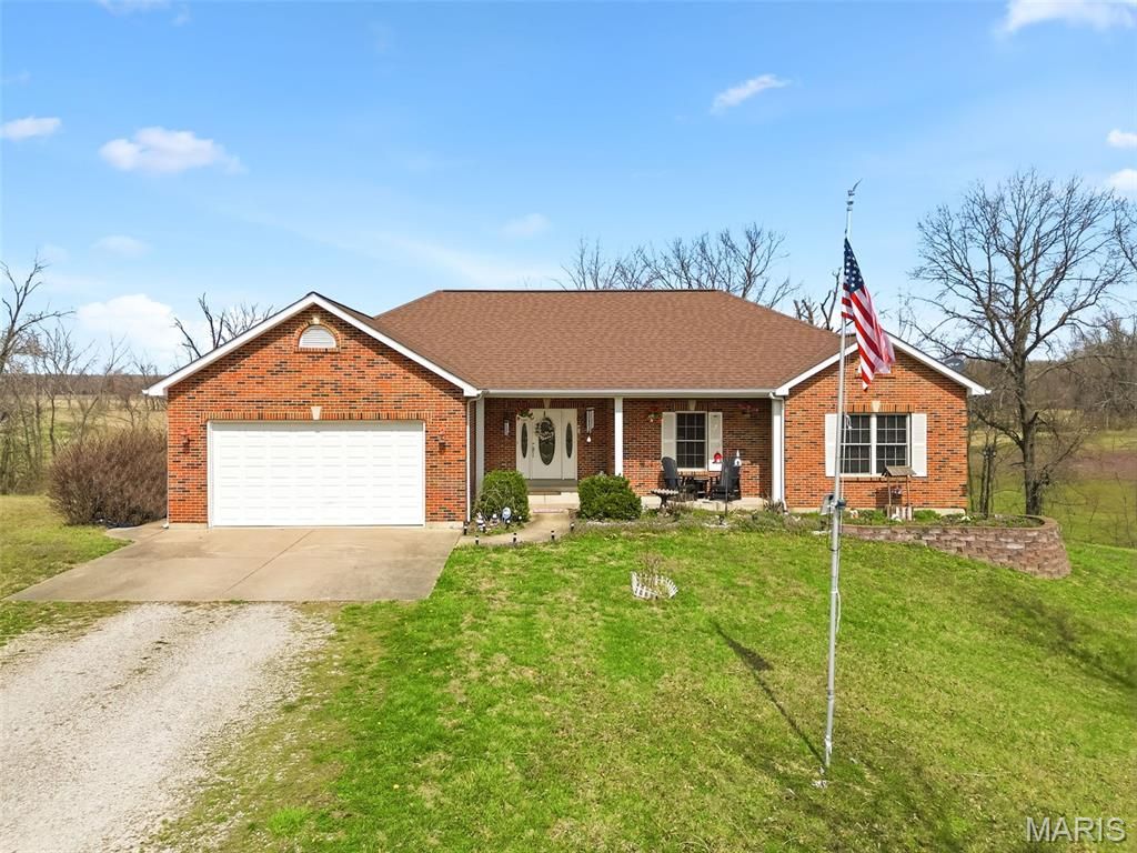 Custom-built, all-brick ranch with 5 bedrooms, 3 full baths, and more than 3,000 sq. ft. of total living area. Country kitchen features custom oak cabinetry, a double door pantry, and stainless steel appliances. 11x18 sunroom off the kitchen/dining room with picturesque views. 9 ft. ceilings, hardwood and ceramic tile floors, and white 6-panel doors. The main level includes a laundry room with utility sink. Primary suite with shared walk-in closet, whirlpool tub and separate shower. The finished lower level includes a recreation room, bedrooms 4 and 5 plus a large walk-in closet in the hallway. Walk out basement has a large concrete patio. 30x48 insulated outbuilding/detached garage with an office, 2 overhead doors, Fire Chief wood burning stove, concrete floors and a large lean-to on the back. 50x80 pole barn with loft space, ideal for storage, hobbies, or large projects. No Restrictions. Andersen double-hung insulated windows. Home has a FEMA Letter Amendment removing the house from the flood plain, property has never flooded. 3.21 acres.