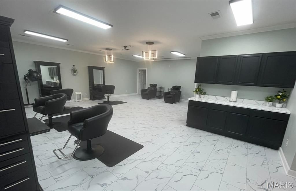 "¢ Salon-ready space with 4 stations + 2 wash bowls