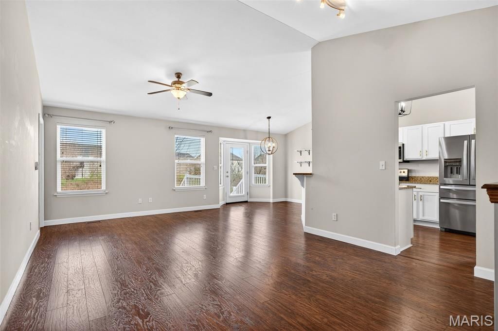 The open floor plan with vaulted ceilings has luxury vinyl plank throughout and a kitchen that boasts white cabinets, pantry and upgraded granite countertops.