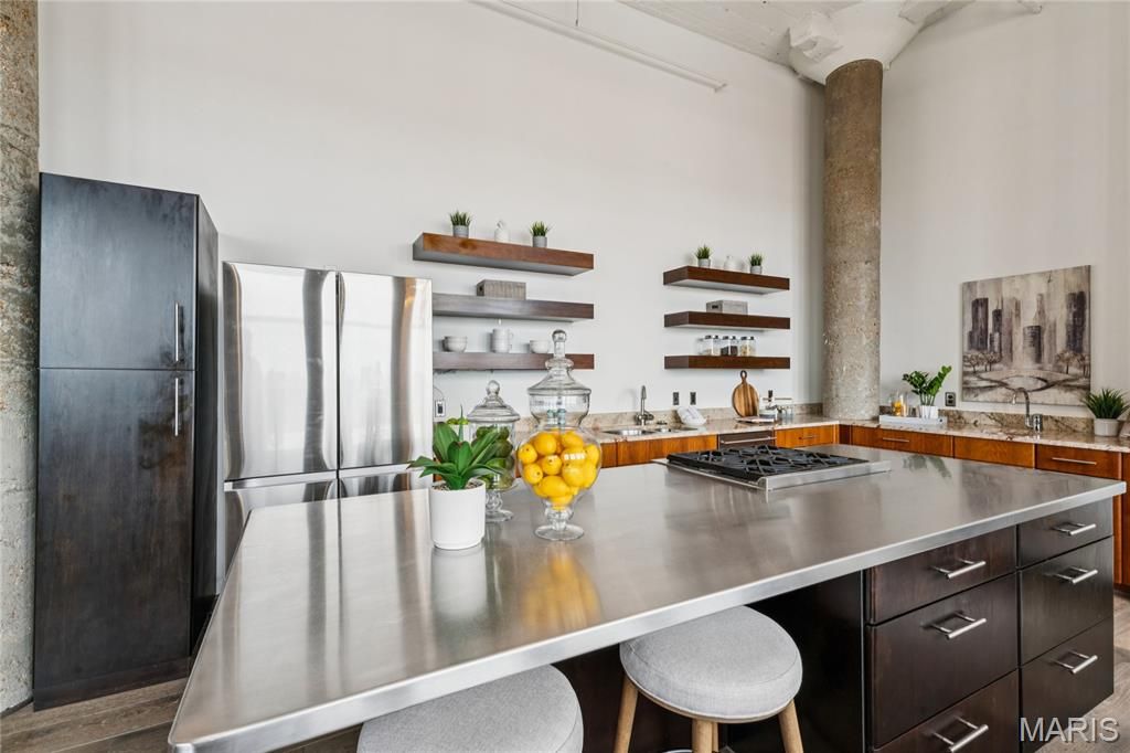 The kitchen is an entertainer's dream, designed by RSI with custom Ultra-Craft solid cherry wood cabinetry, granite countertops, and an oversized stainless steel island with a gas range seamlessly flowing into the living and dining areas, anchored by the crown jewel of this home"”the only suspended stainless steel Fireorb wood-burning fireplace in any downtown St. Louis loft.