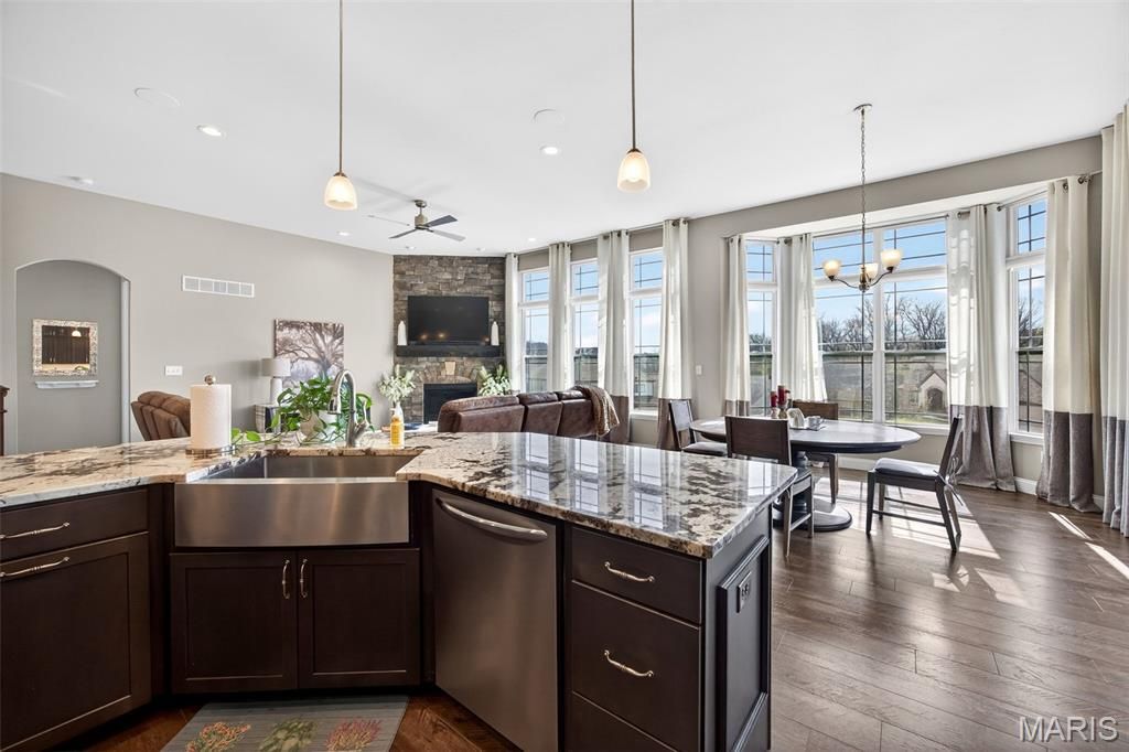 Inside, an inviting open floor plan unfolds with graceful arched doorways, 11ft ceilings, coffered ceilings, and rich architectural touches. The gourmet kitchen is the heart of the home. Complete with granite countertops, stainless appliances including a double wall oven and gas range with pot filler, an oversized breakfast bar, and abundant cabinetry for every culinary need. The adjoining dining area, framed by a bright bay window, leads seamlessly to a covered Tigerwood deck...your private retreat for morning coffee, evening unwinding, or year-round entertaining. The great room offers warmth and ambiance with a gas fireplace, recessed lighting, and views that draw you toward the outdoors. A true main-floor owner's suite provides a peaceful escape with 9ft ceilings, walk-in closets, coffered ceilings, double sinks, a jetted tub, and a separate shower.