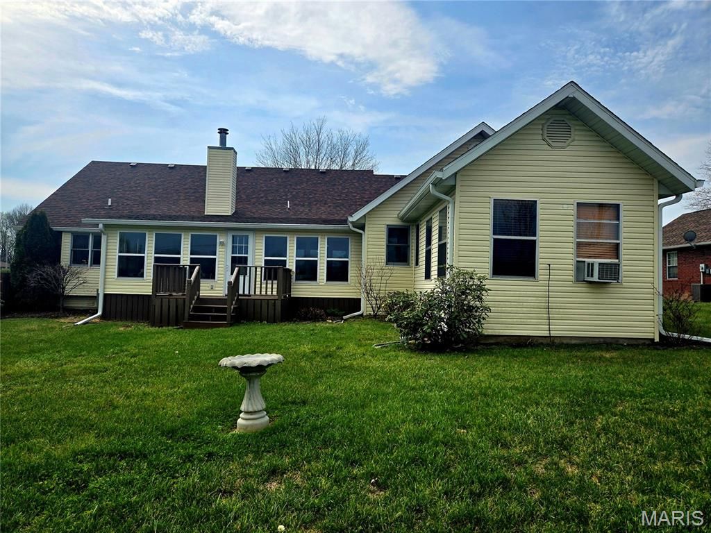 This inviting home is ready for immediate enjoyment offering an open floor plan, the kitchen, a delightful space designed for both everyday meals and entertaining, showcases elegant stone countertops and a versatile breakfast bar. The living room's vaulted ceiling creates an expansive atmosphere, providing a perfect backdrop for quiet evenings or lively conversations, all warmed by the inviting glow of a central fireplace. The primary bathroom provides a refreshing experience with its convenient walk-in shower and a practical double vanity, ensuring ease for daily preparations. This appealing single-family residence offers a split-bedroom floor plan with three bedrooms and two bathrooms, an office, and an all-purpose sunroom. Outside, a charming deck and a welcoming porch extend opportunities for outdoor enjoyment on this corner double lot, complemented by the practical utility of a shed. This residence offers a harmonious blend of comfort and convenience, awaiting its next chapter.