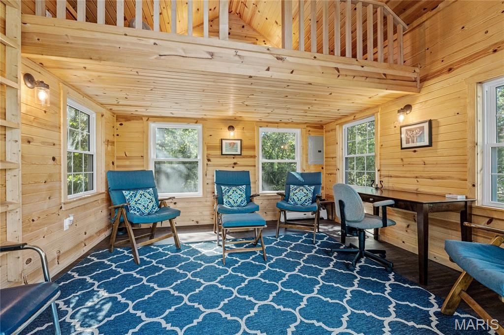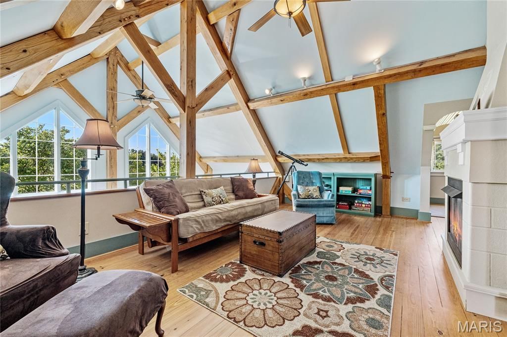 Absolutely gorgeous setting for this wonderful country home on 42 acres with a 1+ acre stocked lake, wonderful guest cabin/studio & 40x30 Morton Building barn. Less than 15 minutes to Hermann wineries & shops or on your bike at the Katy Trail in 10 minutes! Extraordinary custom timber frame home with beautiful views of woods, fields & lake. Original owner/architect designed; the home offers cozy rooms sitting by the 3 fireplaces (one on each floor). Updated kitchen boasts 2 pantries, one walk-in, quartz countertops & updated appliances. The primary bedroom offers a spacious walk-in closet & renovated bath. Enjoy a beautiful loft area (which could be 4th bedroom) & children's play room/library area. The open design offers plenty of light with large windows & sunny views. A finished lower level (included in total sq/ft) offers a bedroom & full bath, family room & plenty of storage. New HVAC 2022. Enjoy a cozy cabin by the lake, 2 docks, fishing and hiking! Duplicate listing of 25023431 Suitable for Bed/Brk